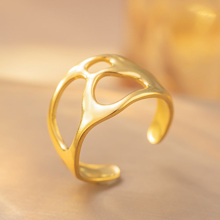 Trendy titanium steel geometric ring with electroplated finish. Available in gold and steel colors, perfect for men and women as a stylish accessory.